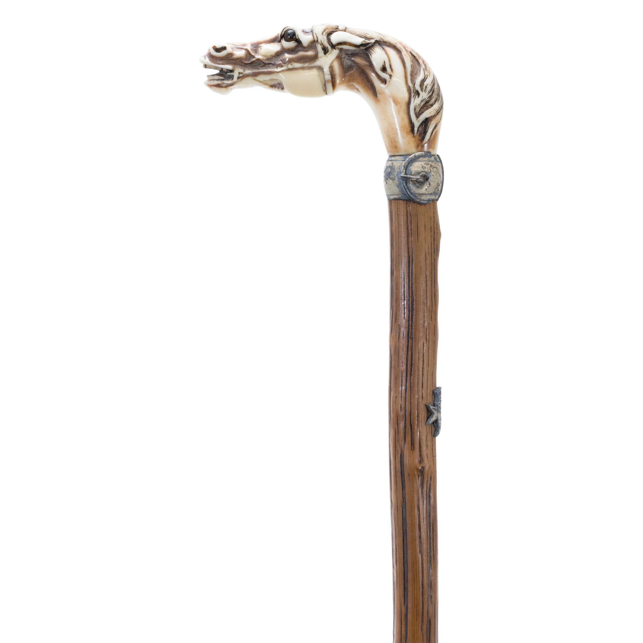 Gentleman's cane with fossilized ivory stallion handle, glass eyes and sterling silver ferule. 36"L