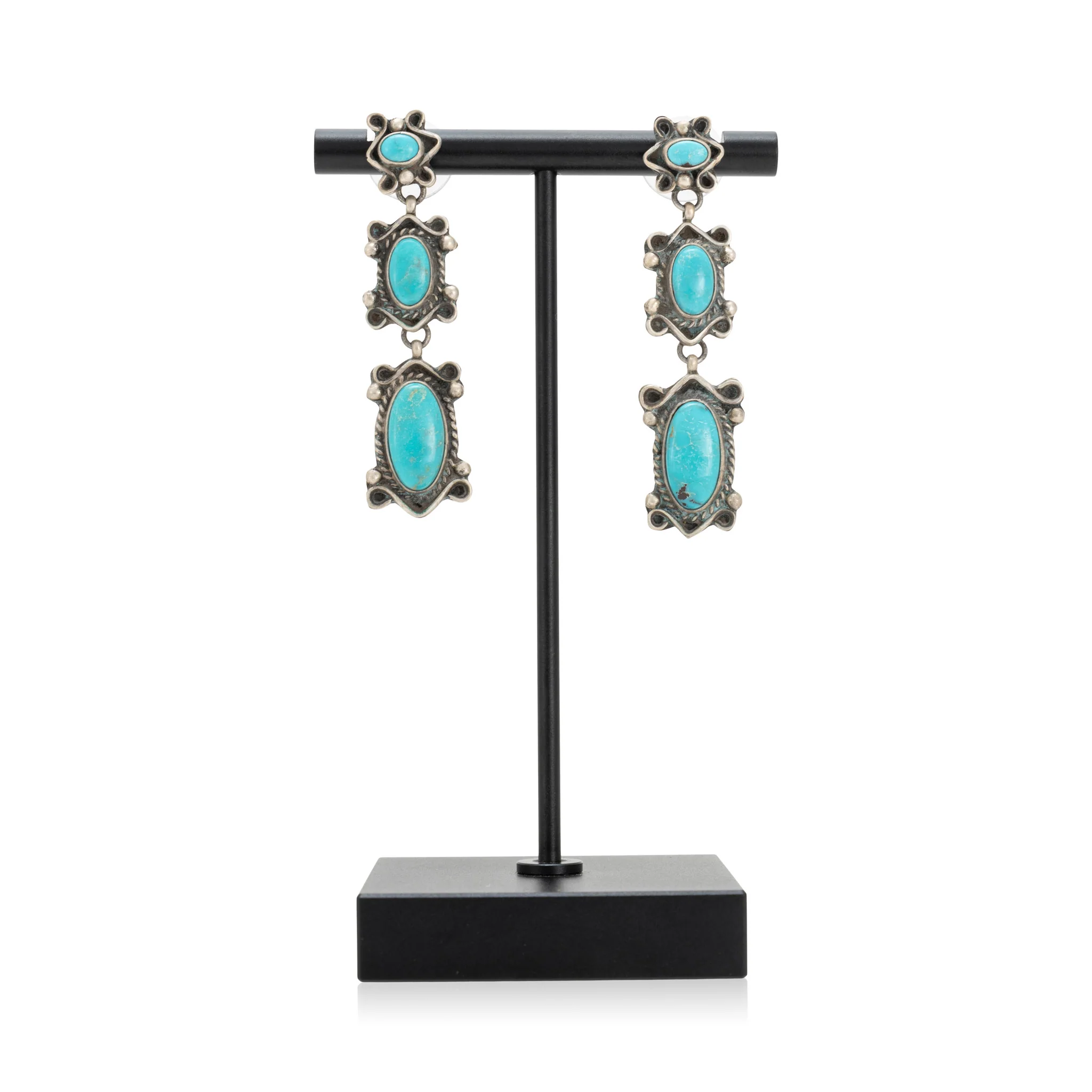 Navajo three-tier earrings with graduated turquoise stones. From the Stormy Mountain Mine. Marked on back "S" and stamped sterling.