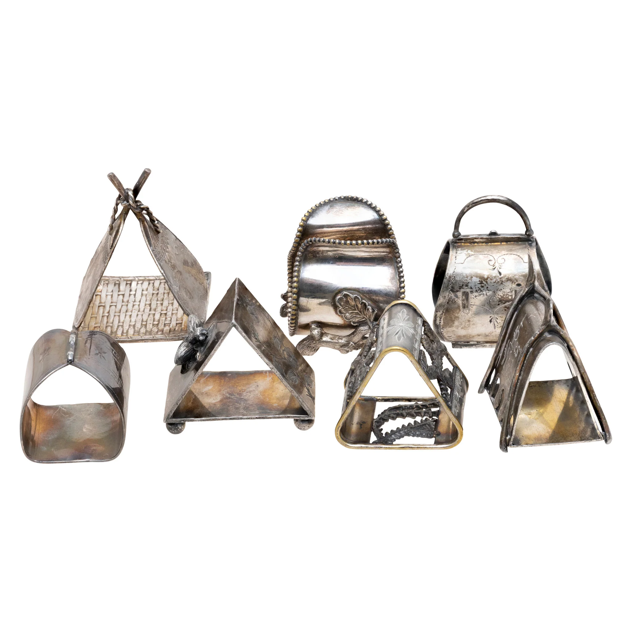 Seven Victorian silverplate napkin rings. First a simple open design with beaded border and oak leaf and branch feet. Marked "B6" on bottom. Monogrammed with letter D.