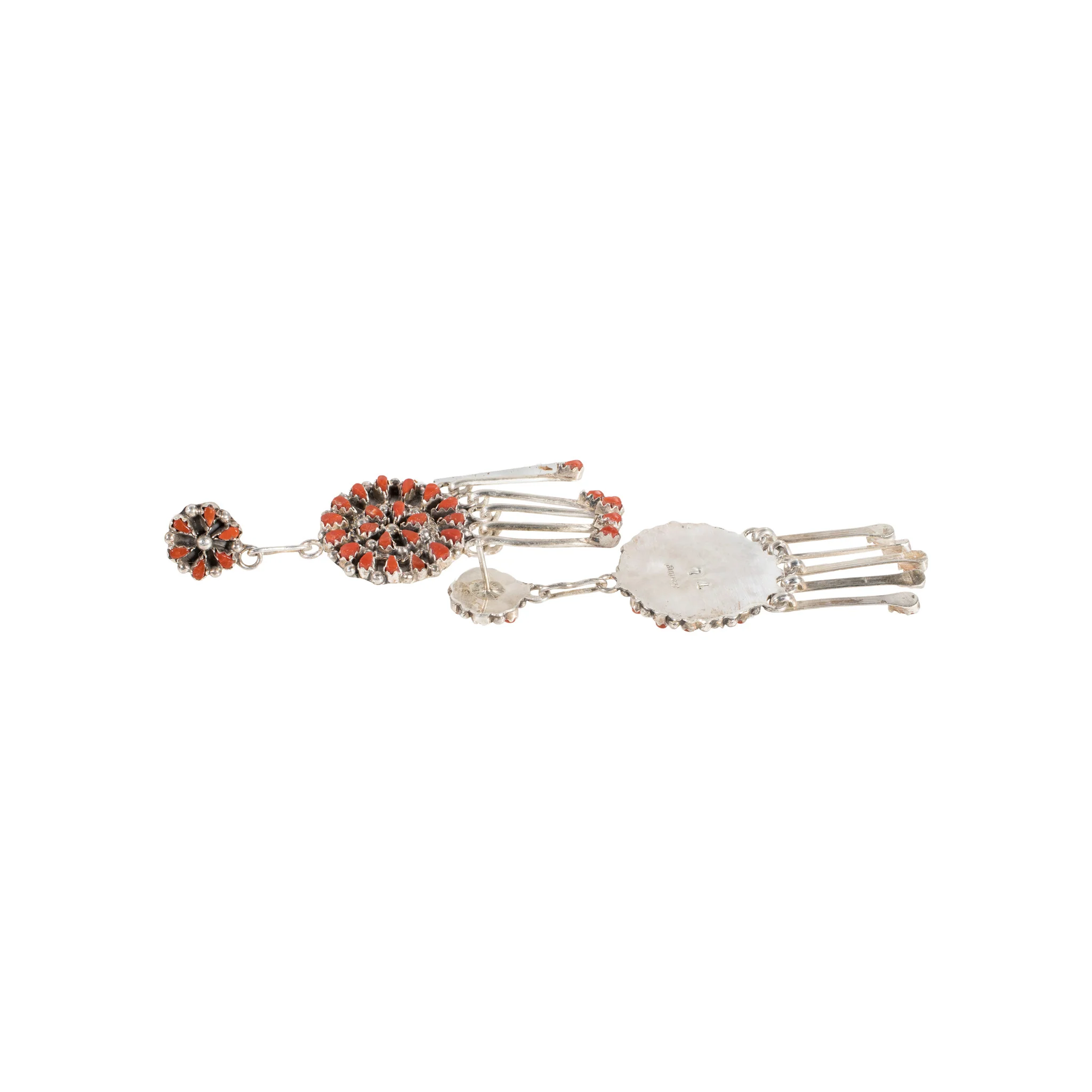 Zuni coral and sterling earrings. Stamped "Sterling" and makers mark "TL" on back. Post backs with six petit point stones each dropped with sunbursts and dangle drops ending in coral stones.